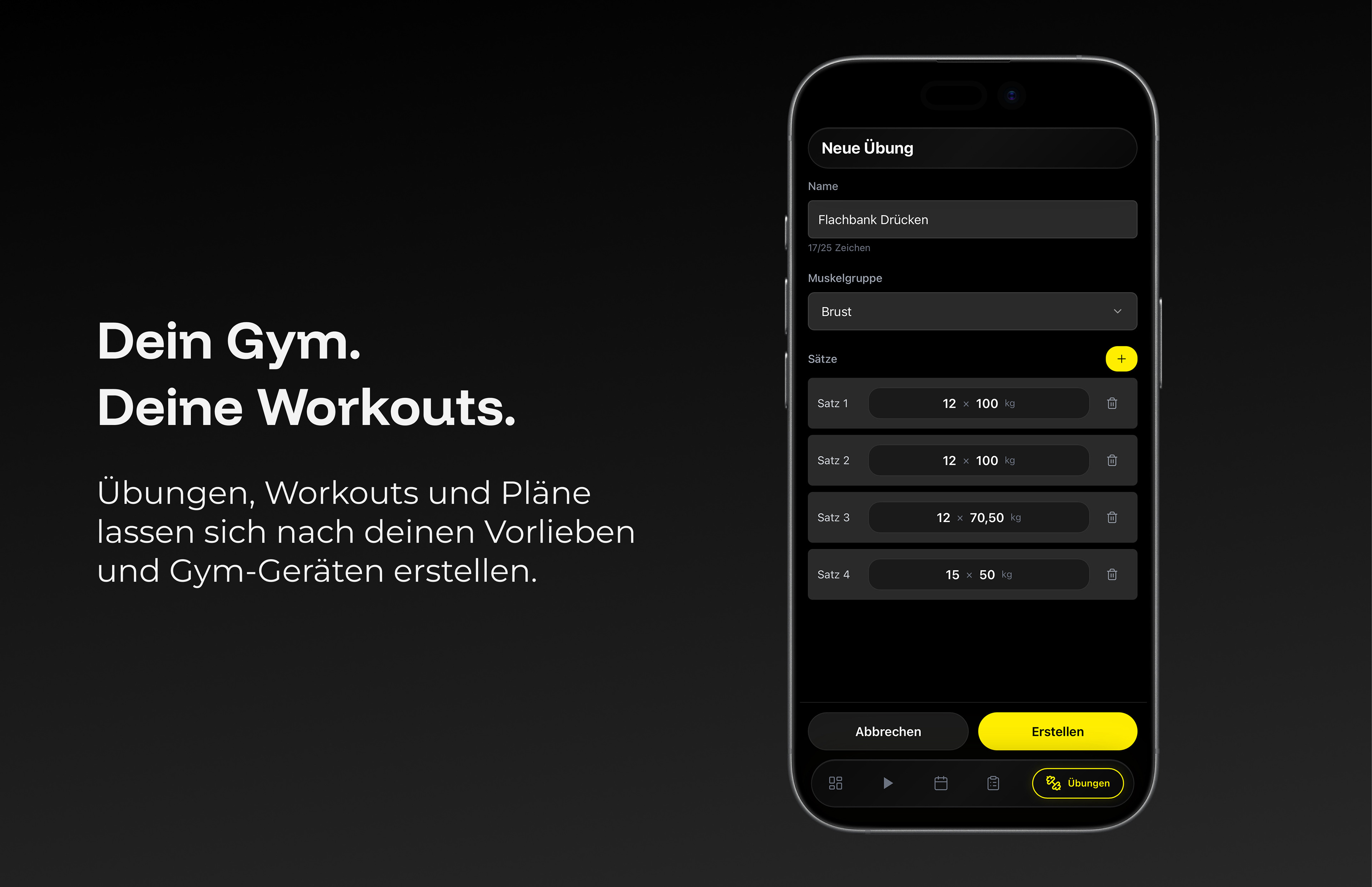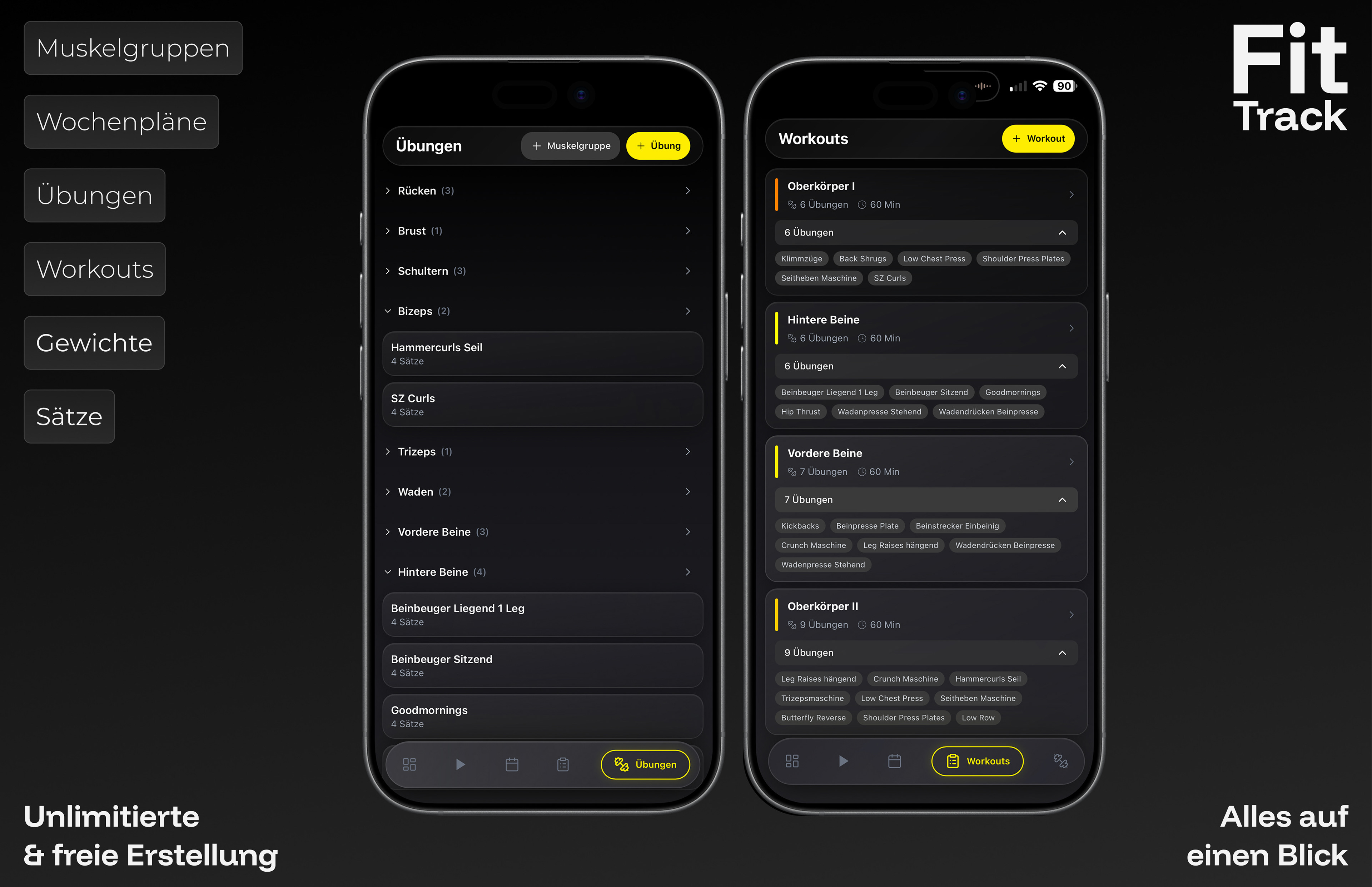 Erstelle Muskelgruppen, Übungen, Workouts und Wochenpläne genau so, wie du trainierst. Egal ob Oberkörper-Unterkörper-Split, Push-Pull-Legs oder dein ganz eigenes System – FitTrack passt sich deinem Training an, nicht umgekehrt. Definiere Sätze, Wiederholungen und Gewichte für jede Übung individuell und stelle dir unlimitiert viele Workouts zusammen.