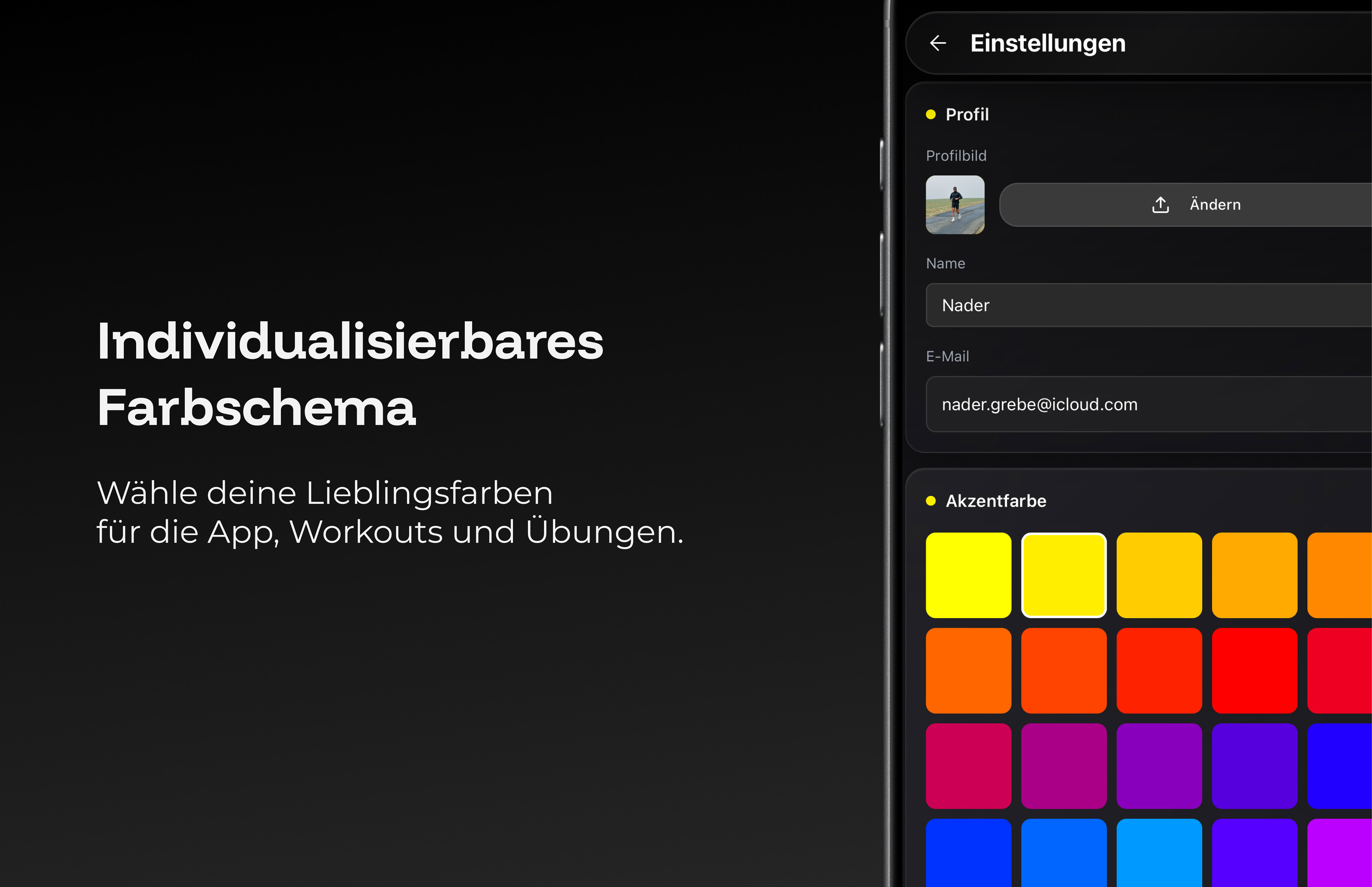 Wähle aus einer großen Farbpalette deine persönliche Akzentfarbe und mach FitTrack optisch zu deiner App. Profilbild, Name und Farbschema – alles individuell anpassbar.