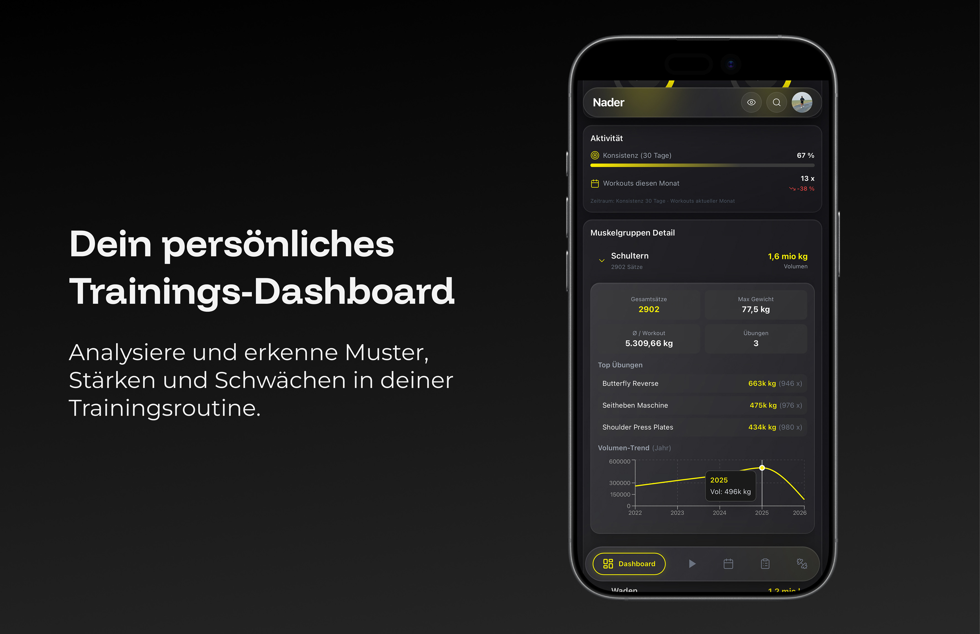Behalte den Überblick über alles, was zählt: Konsistenz der letzten 30 Tage, Workouts pro Monat, Volumen pro Muskelgruppe und deine Top-Übungen. Das Dashboard zeigt dir auf einen Blick, wo du stark bist – und wo noch Potenzial steckt.