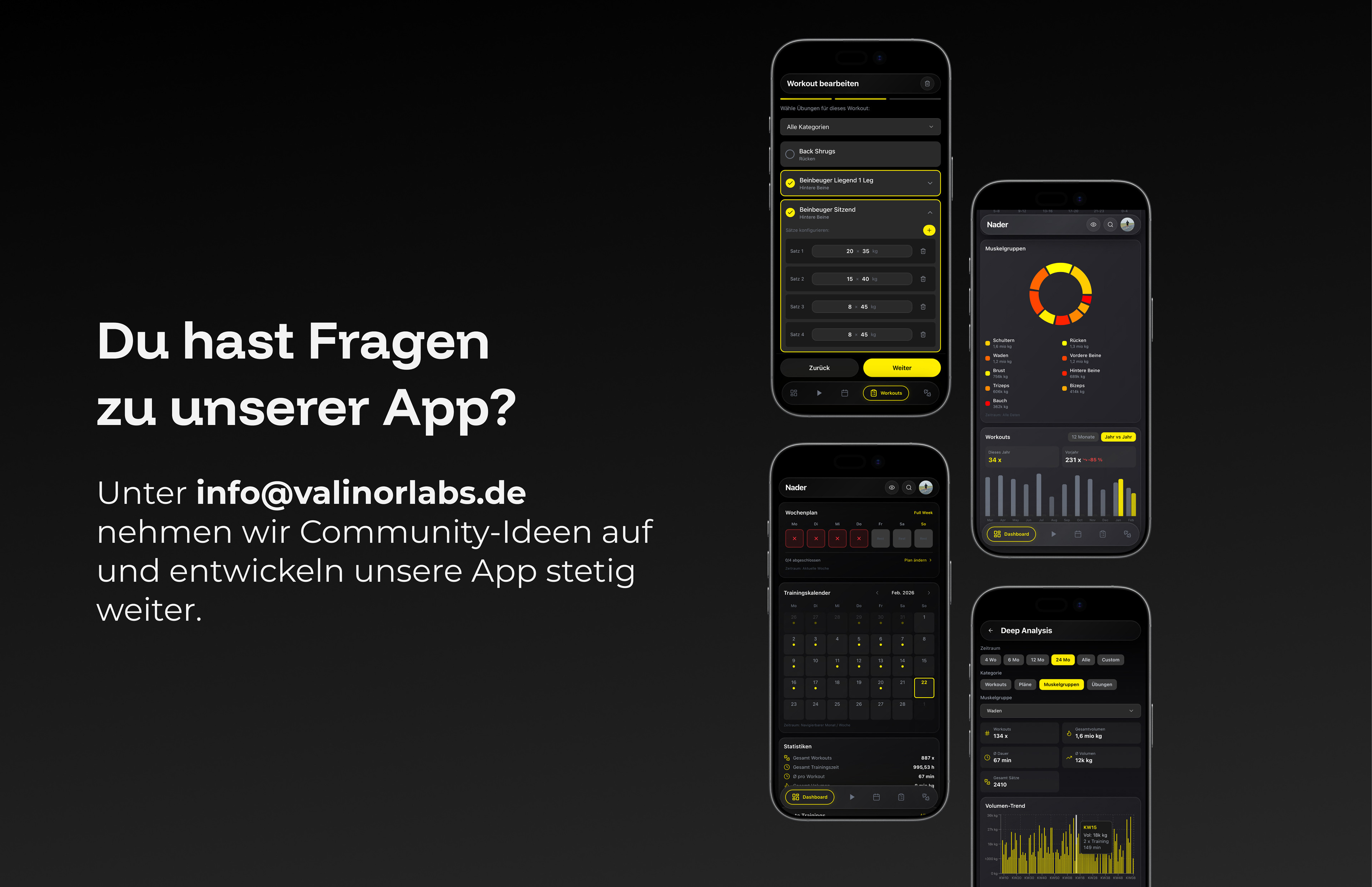 Fragen oder Ideen? Schreib uns an info@valinorlabs.de – wir entwickeln FitTrack gemeinsam mit unserer Community stetig weiter.